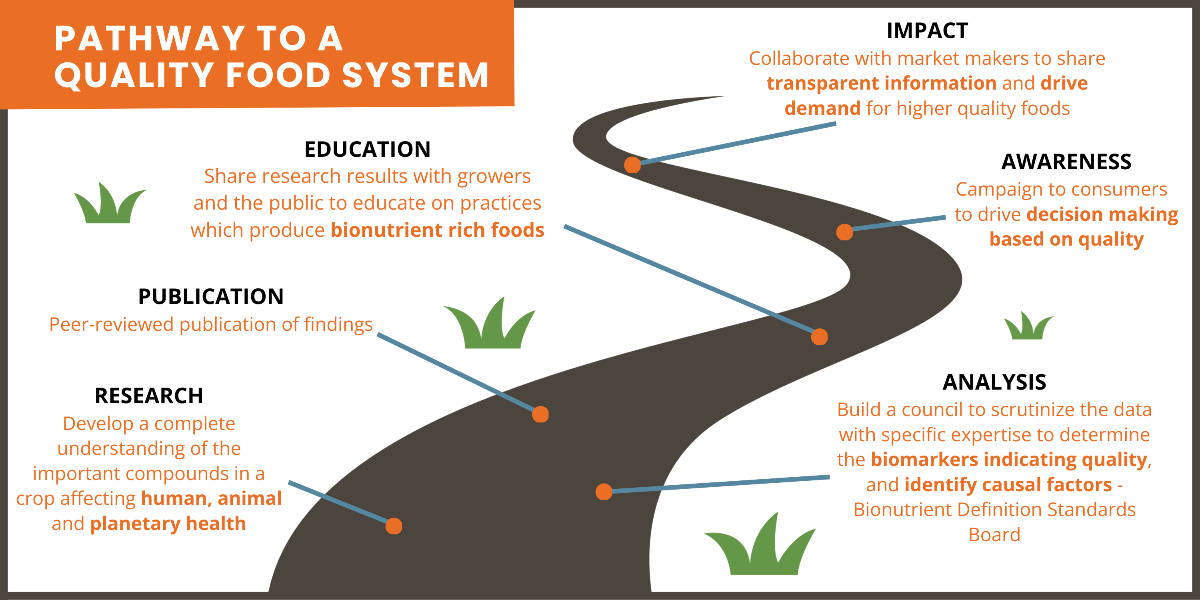 The potential of what’s possible inspires us: Imagine farmers compensated based on quality versus quantity, eaters choosing foods based on their true and transparent nutritional value, and the soils of the earth back to work in symbiosis. Our research has shown that amazing is possible! There are farmers doing an amazing job producing nutrient dense crops. Our mission is to support all farmers to increase the quality of our food supply.