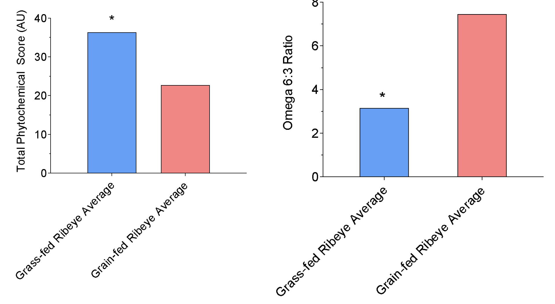 People may have heard that the omega 3 to 6 ratio is one way of looking at the relative healthfulness of animal products. Generally below 4:1 is considered health beneficial with the closer to 1:1 being best. We found a pastured beef sample with a 1:1 ratio and a grain-fed one at 17.8:1. Average for grass-fed was 3:1 and for grain-fed was 7:1.